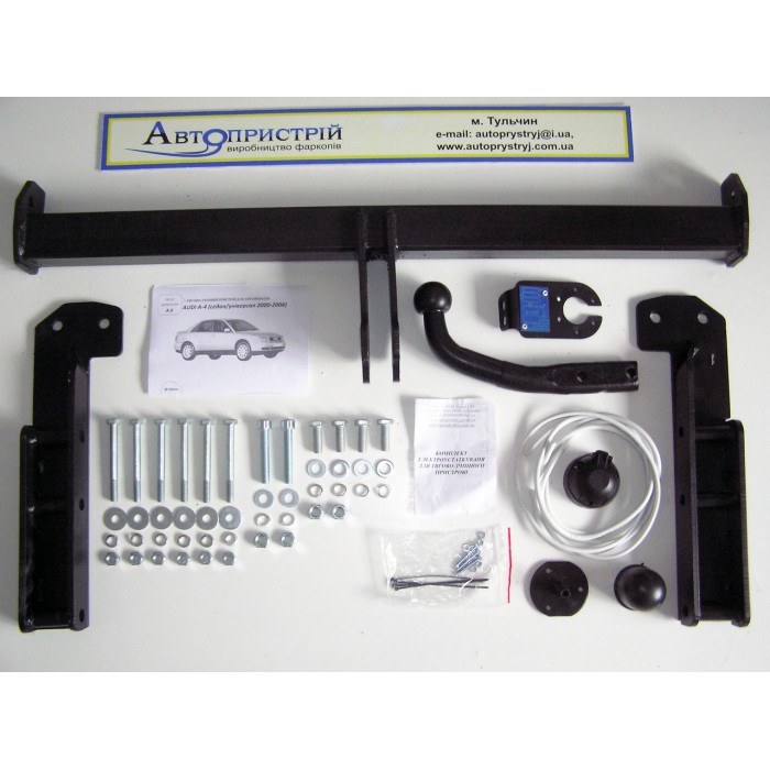 Audi A-4 B-6 (2000-2008) Производитель: "Автопристрій" Тип крюка: Условно-съёмный (на двух болтах) Покраска: Порошковая полиэфирная краска (глянцевая) Наличие документов: Сертификат качества, гарантия от производителя, тех.пасспорт устройства. Вертикальная нагрузка: 75 кг Горизонтальная нагрузка: 2000 кг